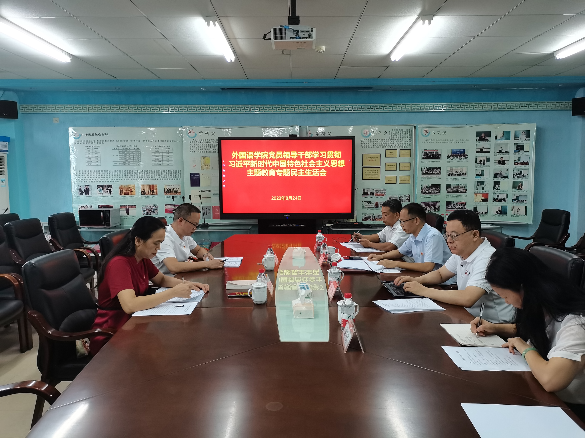 按照自治区和学校党委统一部署要求,8月24日上午,外国语学院党委在国教楼1401会议室召开学习贯彻习近平新时代中国特色社会主义思想主题教育专题民主生活会。学校党委副书记、纪委书记韦雪芳,纪委副书记、监察室主任韦惠文到会指导。会议由学院党委书记黄弢主持,党委副书记、院长张旭,党委副书记陆进强、副院长蓝艳芳等学院领导班子成员参加会议。