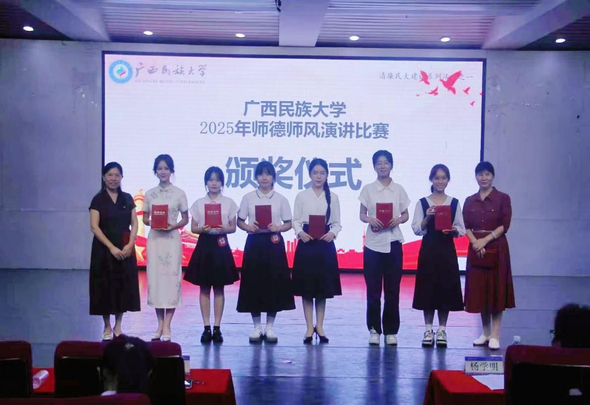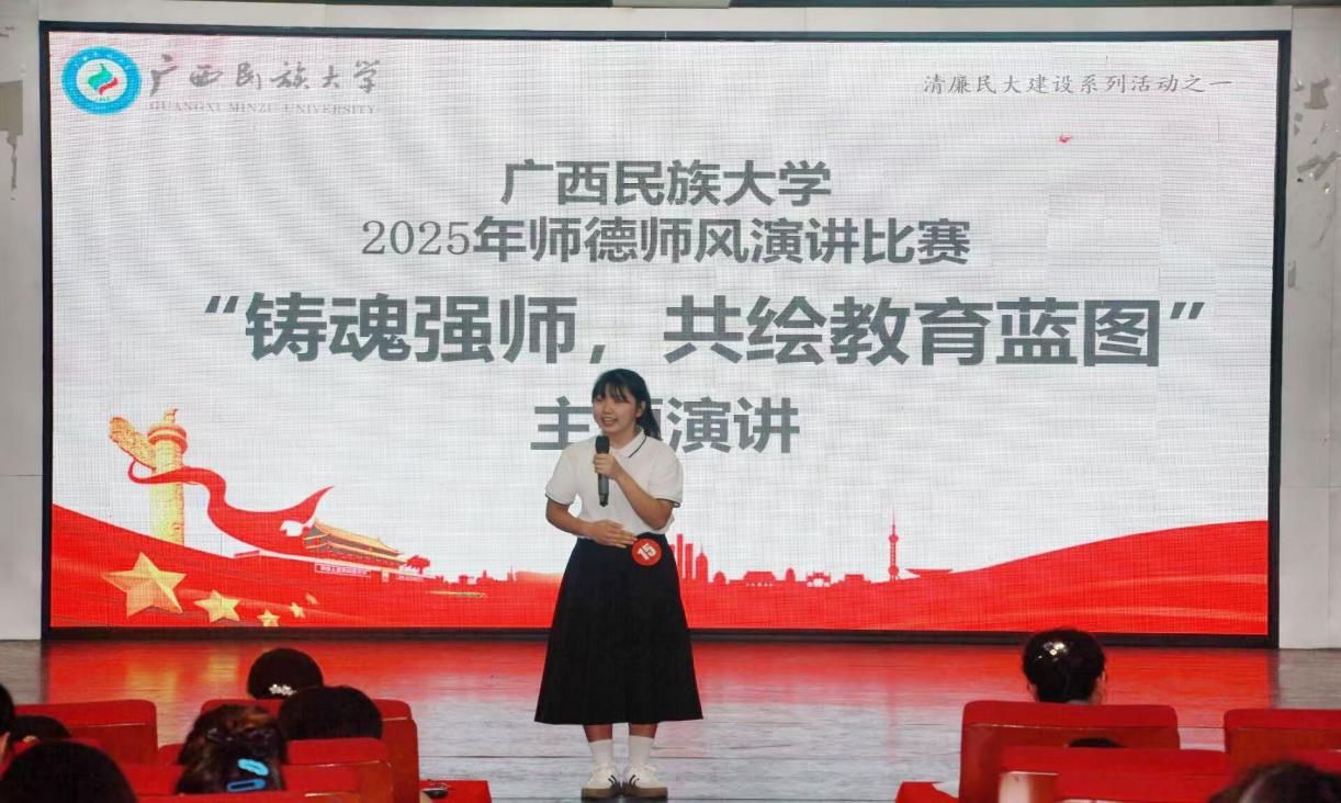 9月23日晚,广西民族大学2025年师德师风演讲比赛在相思湖校区大学生活动中心201室落下帷幕。我院学子蒋宇欣、王兰菲凭借扎实的演讲功底与深刻的师德认知,在比赛中表现突出,双双斩获二等奖,为学院赢得荣誉。