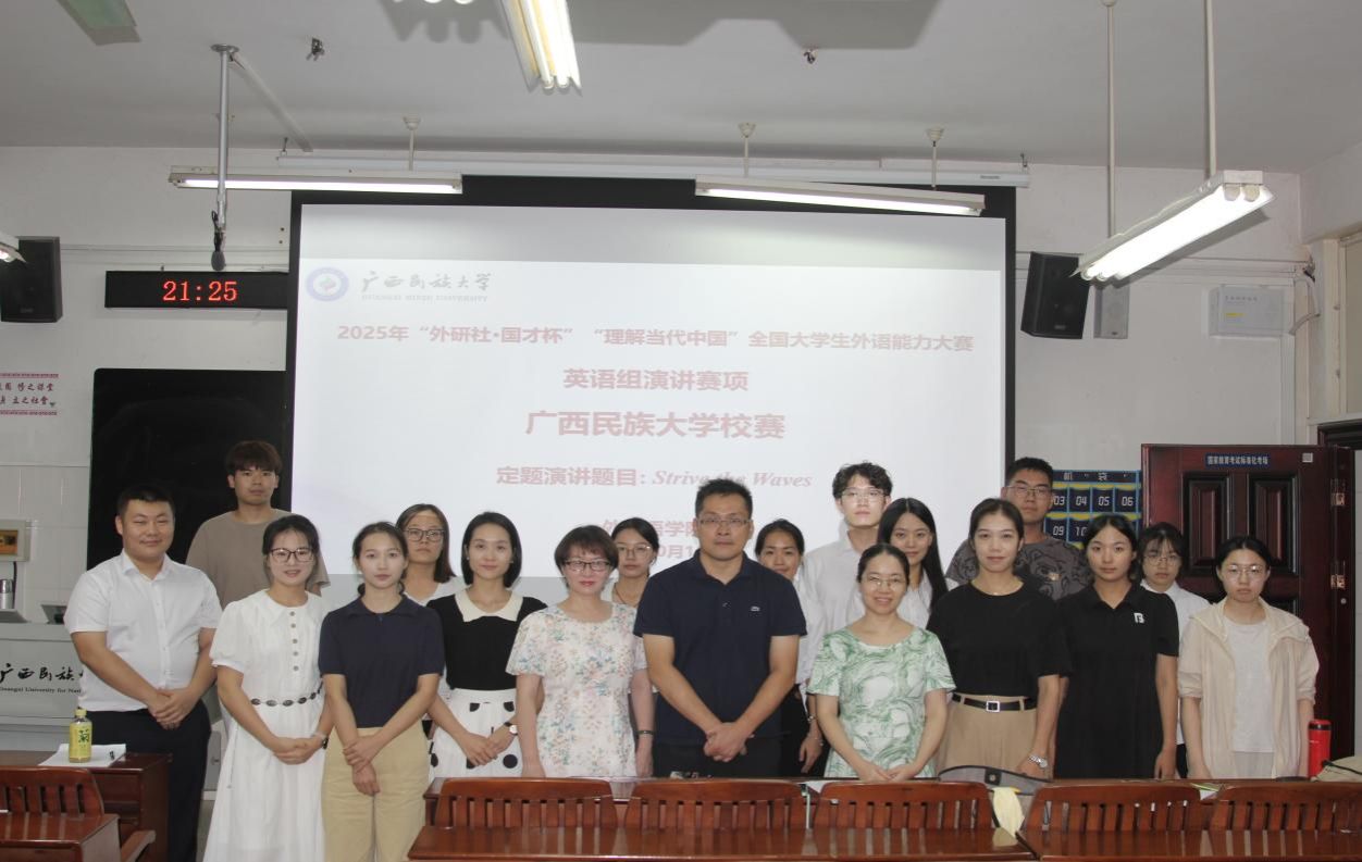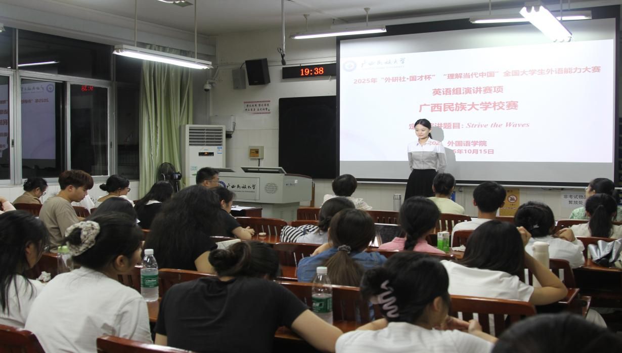 10月15日晚,2025年“外研社·国才杯”“理解当代中国”全国大学生外语能力大赛英语组演讲赛项广西民族大学校赛(英语专业组),在相思湖校区校友楼205教室顺利举行。本次比赛是外国语学院英语专业组的第二轮选拔,参赛学生包括各年级本科生和研究生,现场气氛紧张而热烈。