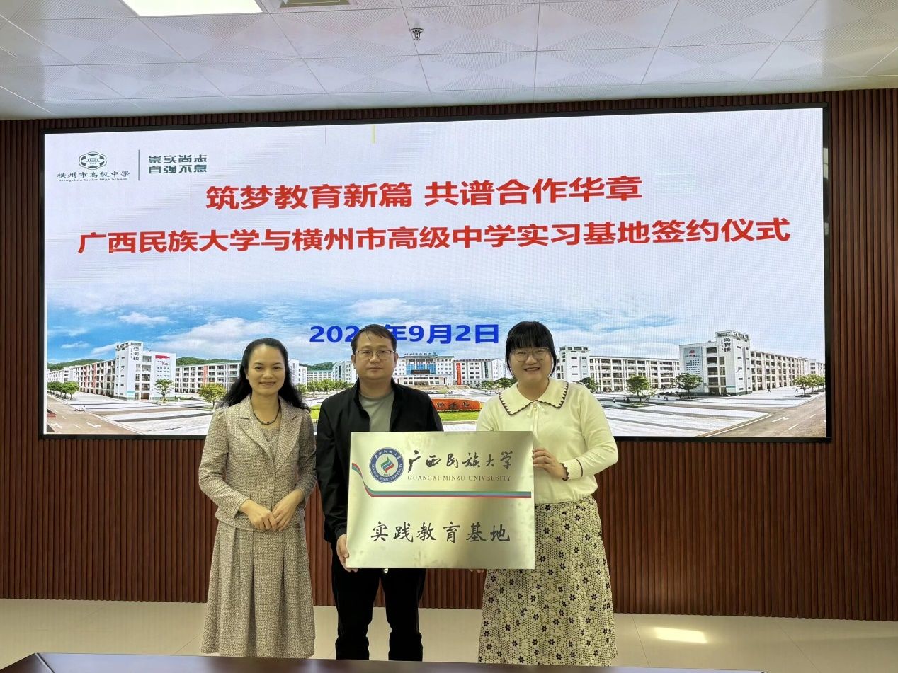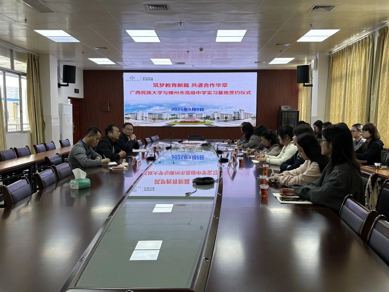 2025年9月2日上午,广西民族大学与横州市高级中学(以下简称“横高”)实习基地签约仪式在横高综合楼6楼顺利举行。外国语学院潘艳红副院长、教务处卫必娴科长带队,雷丹、邓玉文两位老师及在横高实习的英语实习生共同参会。横州市高级中学蒙之团校长、李争主任、邓积锋主任出席仪式,双方围绕师范生实践培养、教研资源共享、学生生涯规划指导等方面进行交流,正式达成合作共识,共同开启校地协同育人的全新征程。