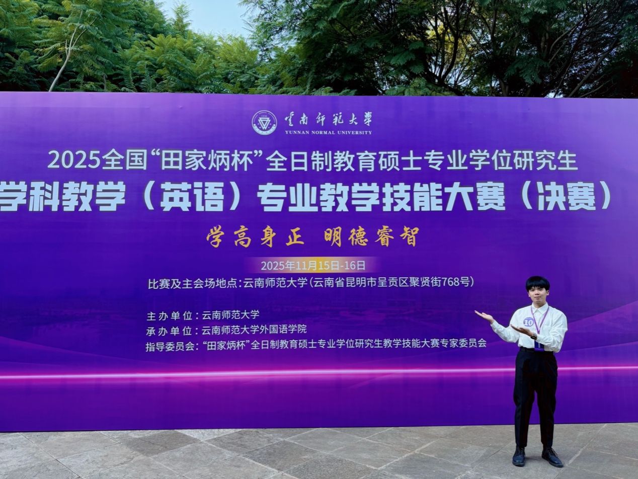 全国100所高校的251名优秀选手历经选拔晋级决赛,在现场模拟授课与现场答辩两大环节中展开激烈角逐。我院2024级学科教学(英语)专业硕士研究生吴文迪同学,凭借扎实的专业功底与出色的临场表现脱颖而出,以前20%的成绩荣获全国决赛二等奖。