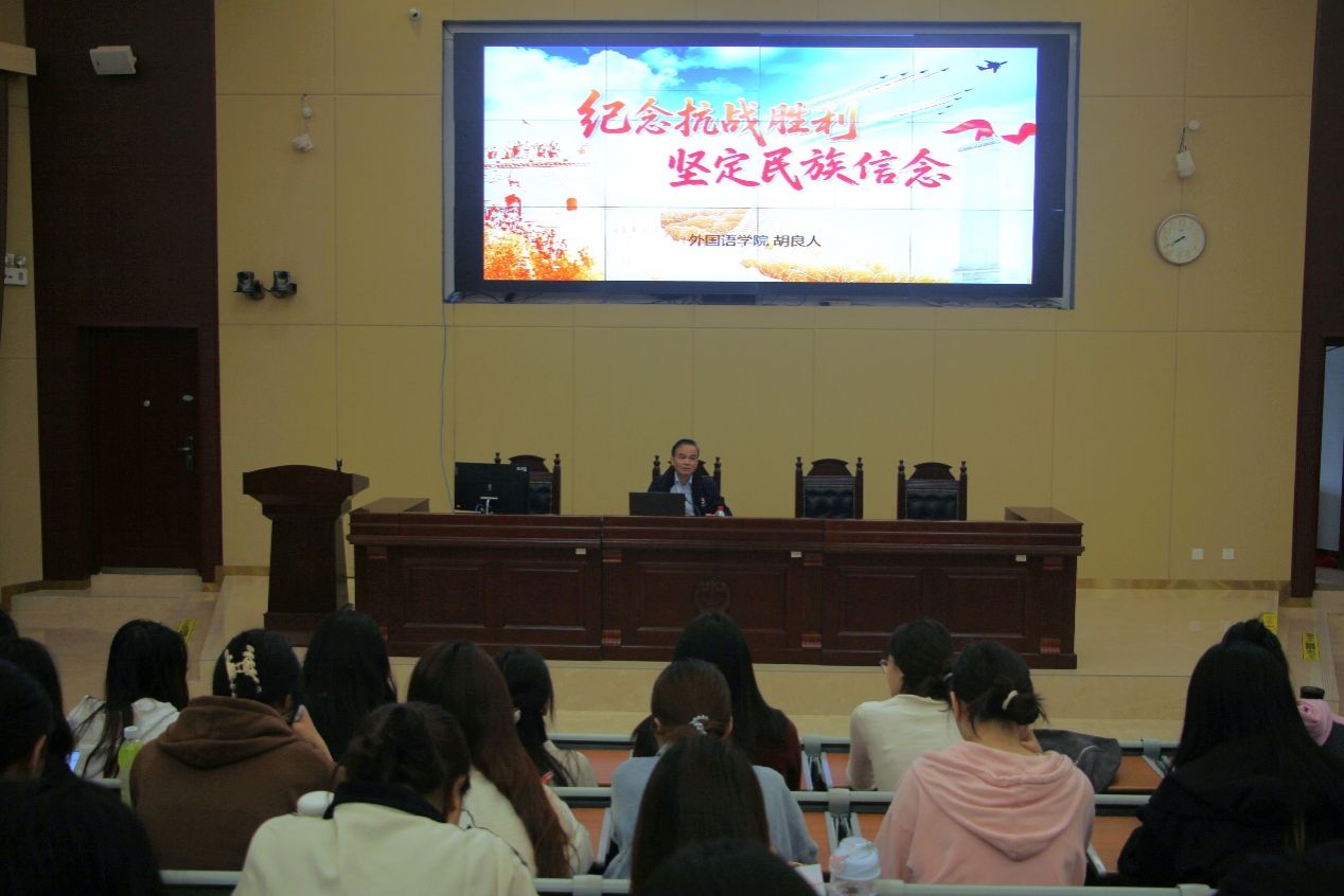 12月10日晚,外国语学院党委书记胡良人在创新楼报告厅作以“纪念抗战胜利,坚定民族信念”为主题的“形势与政策”专题讲座,学院2023级全体学生、2022级实习返校的学生代表参加讲座。