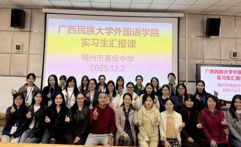 2025年12月2日上午,外国语学院20名英语师范专业大四实习生公开课汇报活动在横州市高级中学茉莉校区举行,集中展示了实习生的实习成果。
