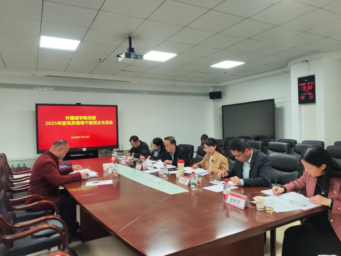 按照自治区及学校党委统一部署,1月16日上午,外国语学院党委在国际教育综合楼1401会议室召开2025年度党员领导干部民主生活会。学校党委统战部副部长黄炤英到会指导。会议由学院党委书记胡良人主持,学院党委副书记、院长刘雪芹,党委副书记、纪委书记高崧耀,学院党委委员、副院长蓝艳芳、潘艳红出席会议,副院长肖志兵列席会议。