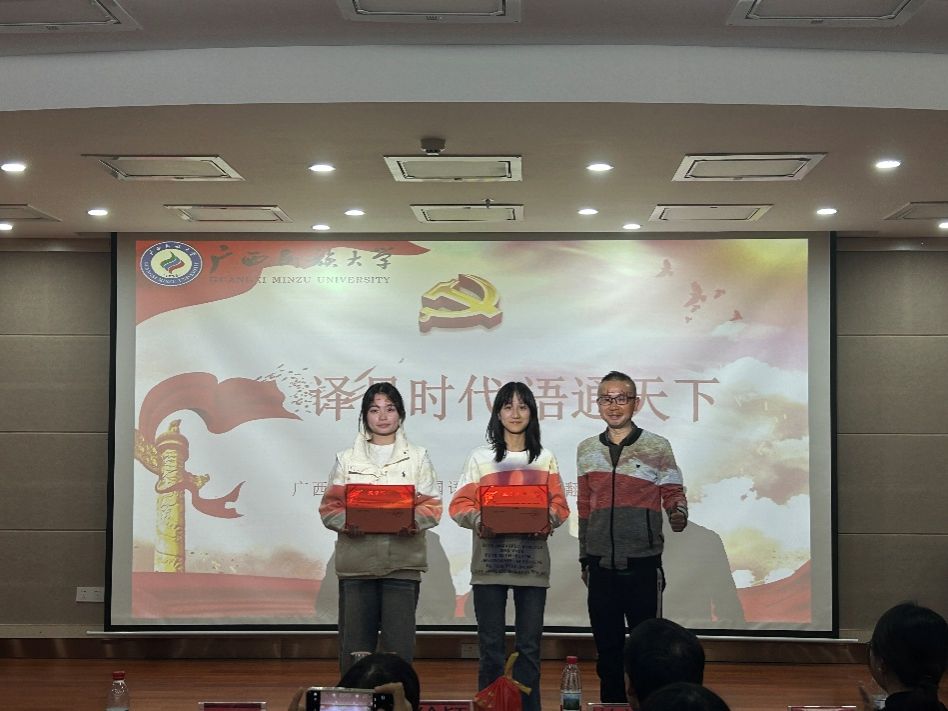 (翻译系徐颖老师为荣获一等奖的小组代表颁奖)