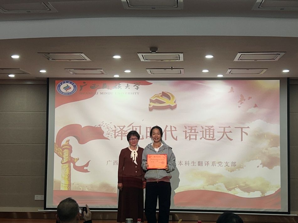 (本科生翻译系党支部书记吕雅芬为荣获优秀奖的小组代表颁奖)