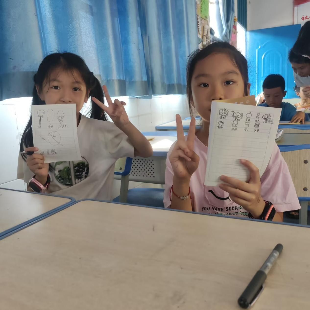 在课堂上,志愿者设计了看图猜美食、画喜爱美食等互动环节,通过活动,引导小朋友们复习巩固英语单词。课堂氛围活跃,孩子们欢笑声不断。