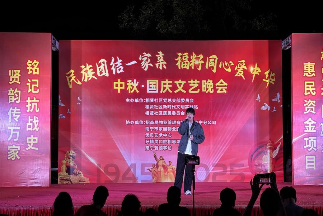 9月27日,相贤社区举办的“民族团结一家亲,福籽同心爱中华”中秋·国庆主题文艺晚会精彩开演。现场热闹非凡、气氛热烈。我院龙炫龙同学带来独唱《世界赠与我的》,以饱满的热情和富有感染力的嗓音获得了现场观众的一致好评。他的演绎将歌曲中对生命的热爱、对世界的珍重及对美好生活的向往,传递给每一位观众,演唱结束后现场响起热烈掌声与欢呼声。