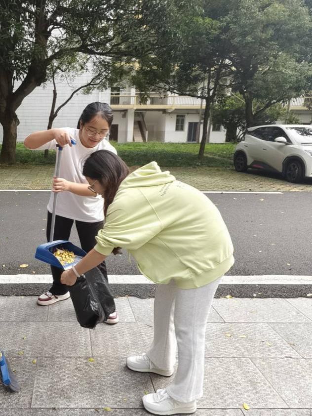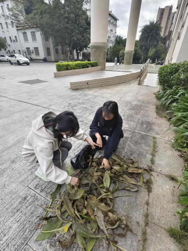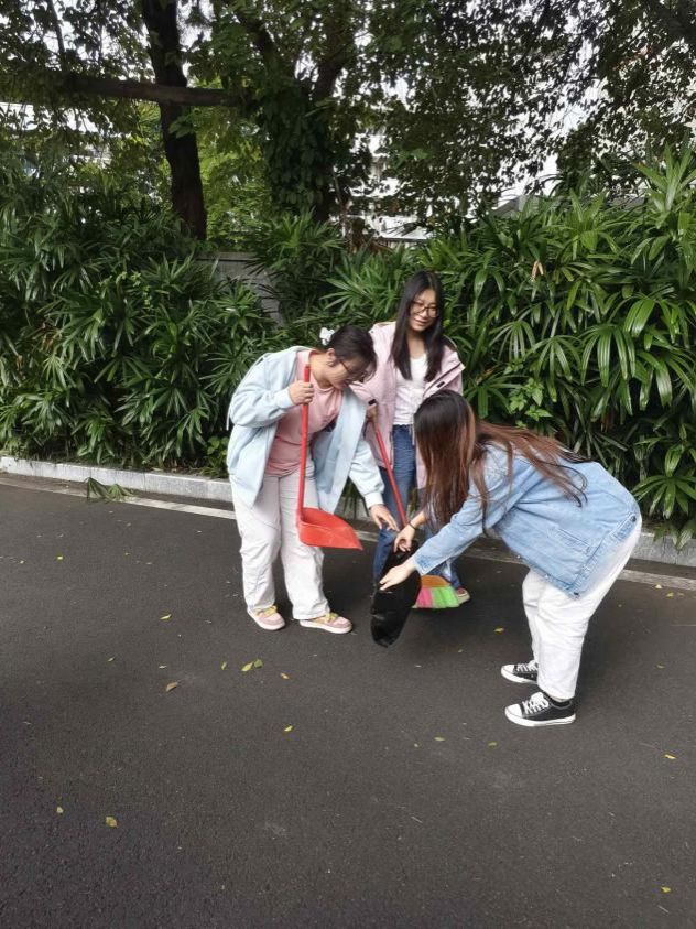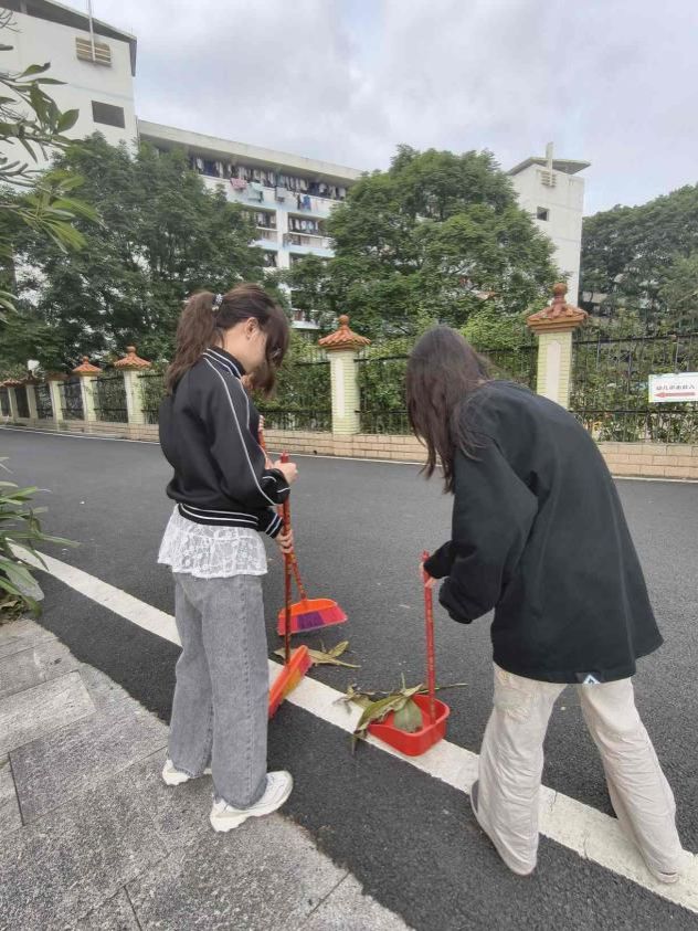 11 月 10 日下午两点半,国际教育综合楼楼前空地上,同学们手持扫帚、铲子、垃圾袋等工具准时集合,开启首场劳动。活动前,班委按场地特点分工,成立 “清扫组”“铲除组”“收纳组”,形成高效协作闭环。“清扫组” 细致清扫步道落叶与尘土,不留死角;“铲除组” 专攻角落顽固垃圾与碎石,干劲十足;“收纳组” 分类装袋、集中清运,筑牢卫生防线。同学们专注协作、默契配合,在欢笑中将劳动辛苦化作协作快乐与责任担当。
